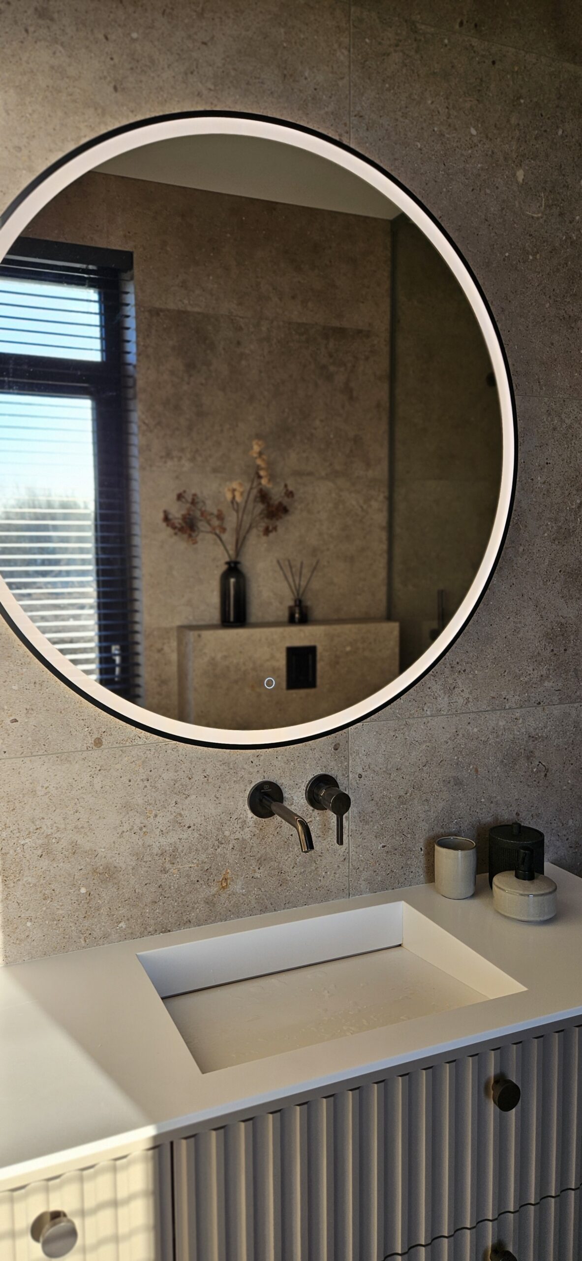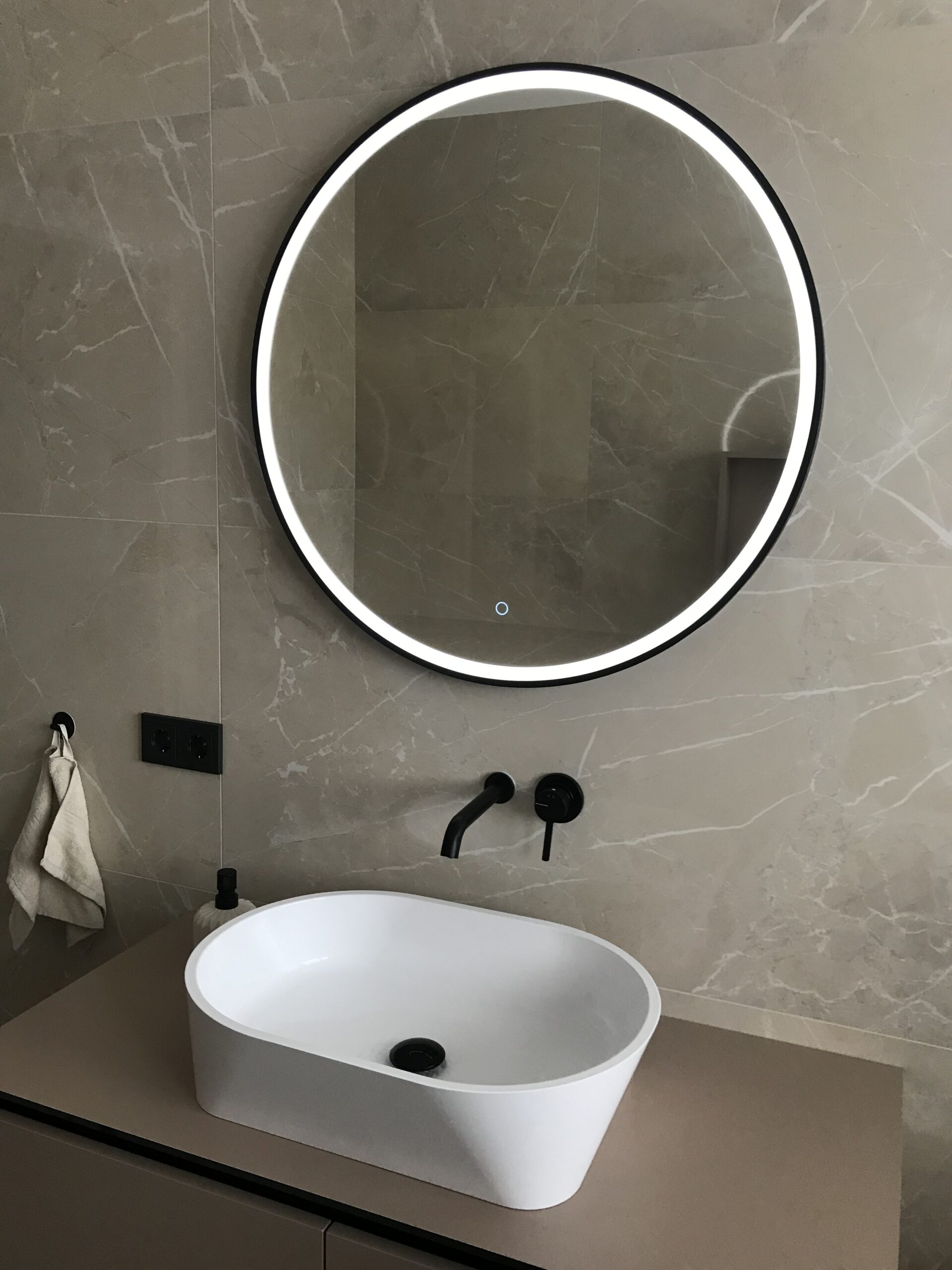 NEO 800 mm ümmargune LED-peegel esivalgustusega – kaasaegne, vastupidav ja kõrge kvaliteediga lahendus teie vannituppa. Erinevalt paljude tootjate MDF-raamidest on sellel mudelil powder coated aluminium frame. Alumiinium tagab erakordse tugevuse ja pikaealisuse, matt must viimistlus aga lisab minimalistliku elegantsi.