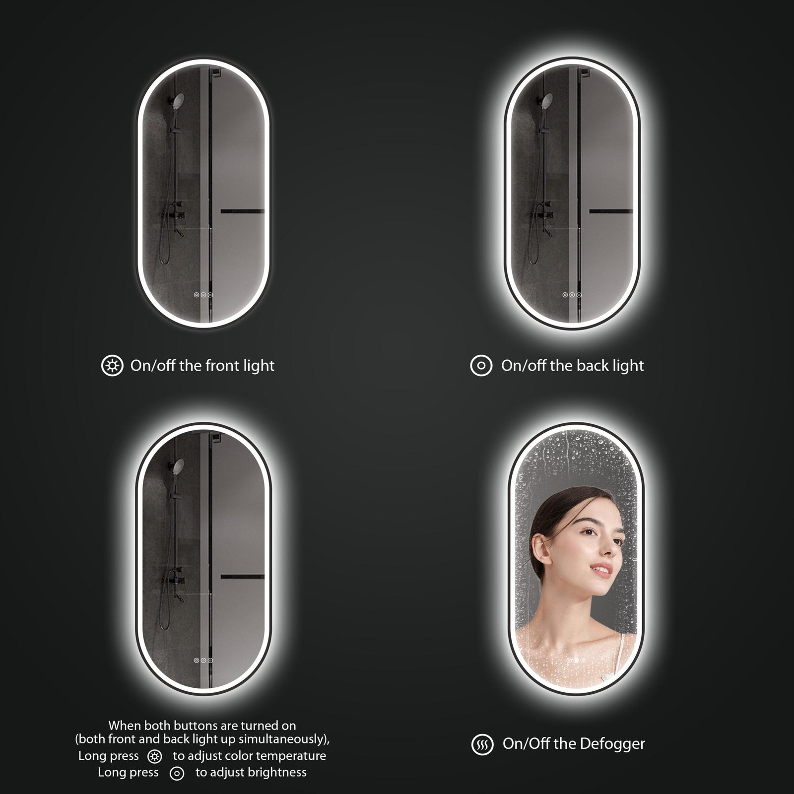 Peegli funktsioonide hulka kuuluvad: reguleeritav valguse heledus ja värvustemperatuur (soe kuni külm valgus), udu eemaldamise plaat, mida saab sisse lülitada vastavalt vajadusele, ning powder coated aluminium frame, mis tagab vastupidavuse ja niiskuskindluse.
