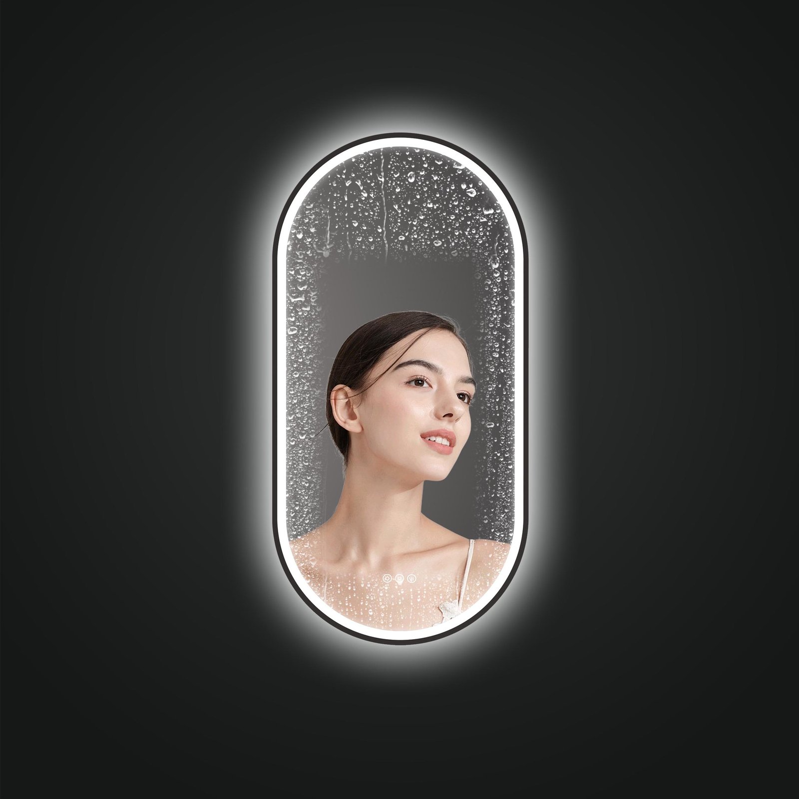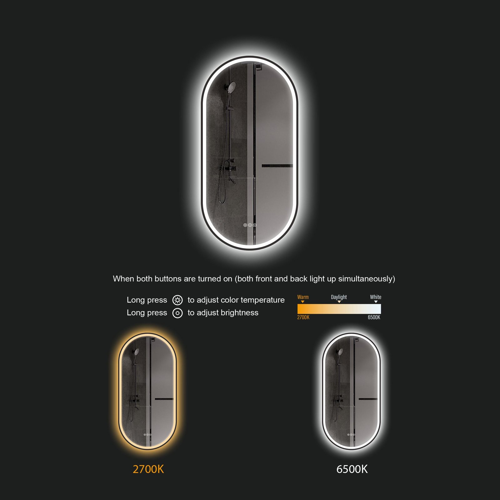 SOFI 500×1000 mm ovaalne LED-peegel – see on kahekordne valgustus ühes peeglis, loodud vastuseks klientide soovidele ja tihti esinevale dilemmale: kas valida esivalgustus või tagumine valgustus?