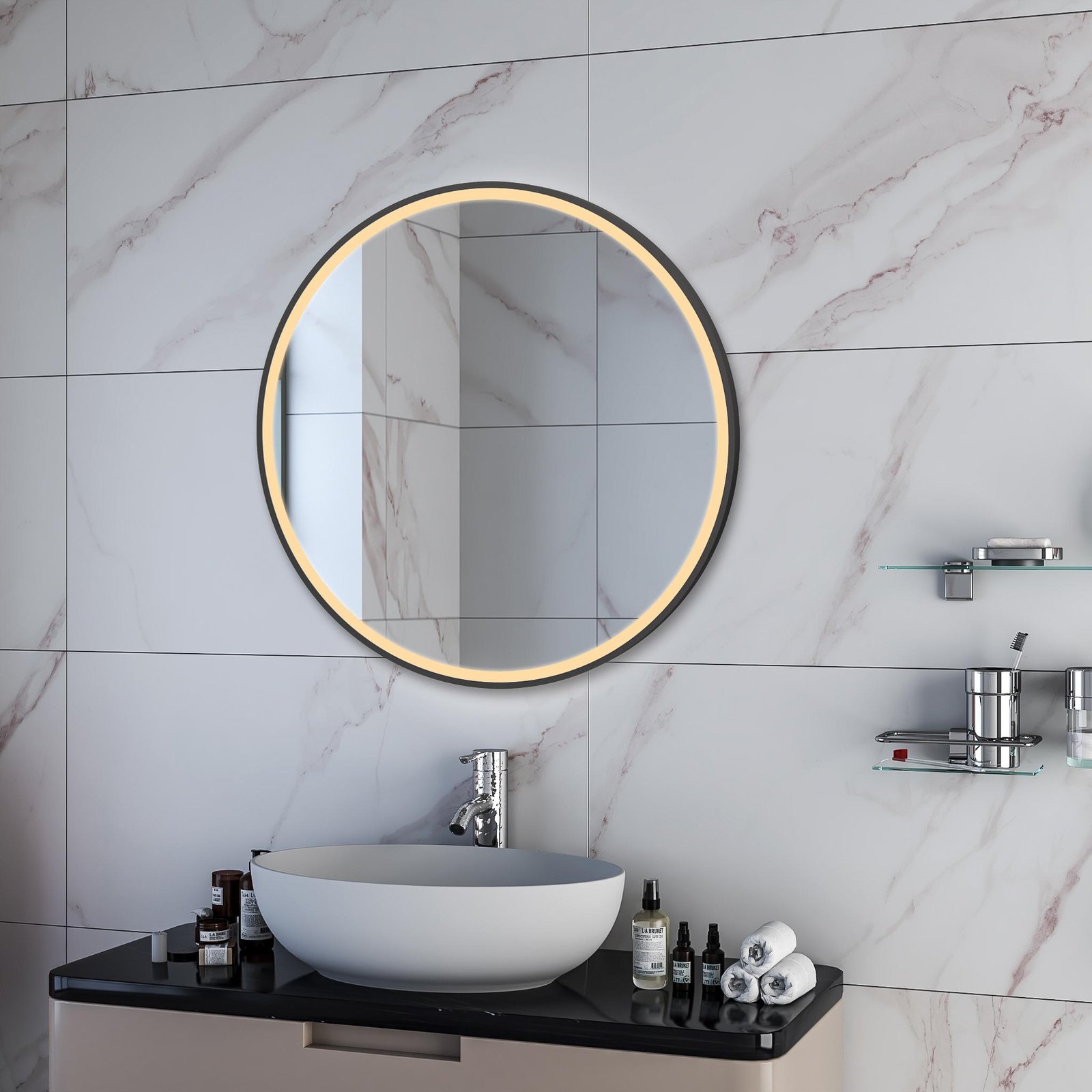 NEO BASIC 800 мм круглое светодиодное зеркало с фронтальной подсветкой - Сочетание минималистичного дизайна и функциональности, идеально подходящее для современной ванной комнаты. Матовый черный Алюминиевая рама с порошковым покрытием придает зеркалу долговечность и стильный вид.