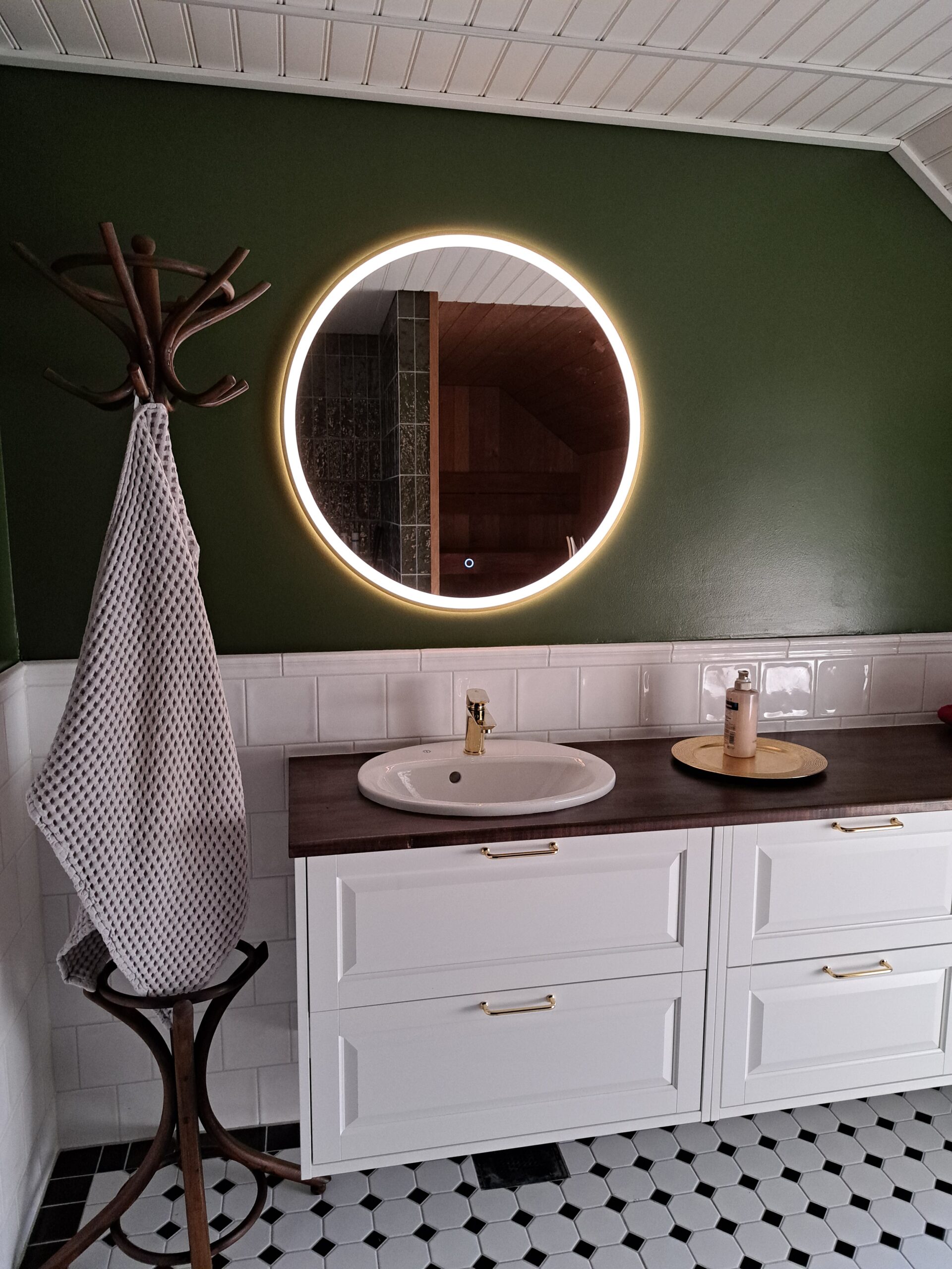 NEO 800 mm ümmargune LED-peegel esivalgustusega – kaasaegne, vastupidav ja kõrge kvaliteediga lahendus teie vannituppa. Erinevalt paljude tootjate MDF-raamidest on sellel mudelil Алюминиевая рама с порошковым покрытием. Alumiinium tagab erakordse tugevuse ja pikaealisuse, samas kui matt kuldne viimistlus lisab luksust ja elegantsi.