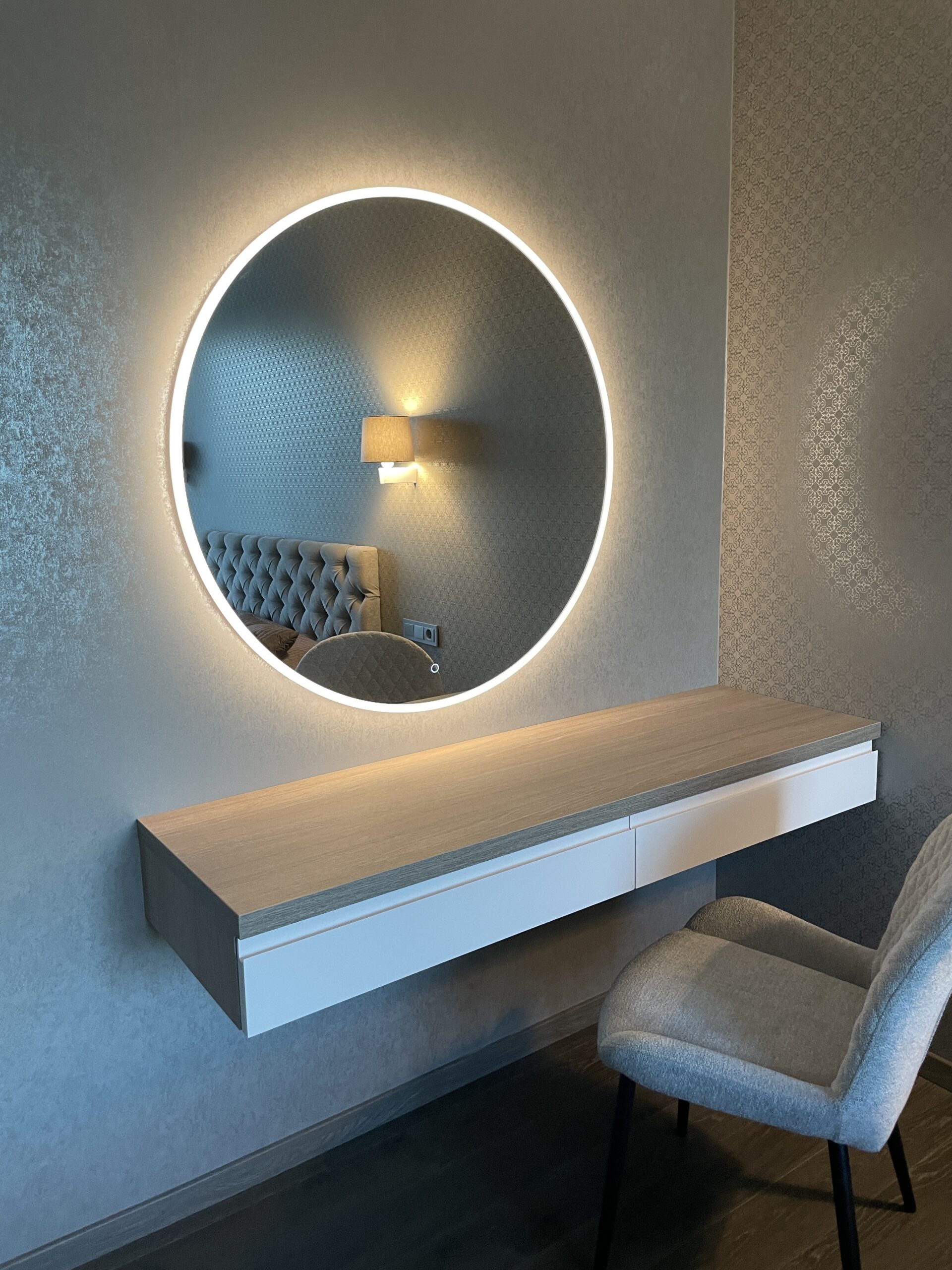 Ümmargune disain lisab elegantsi, samas kui esivalgustus kogu peegli ümbermõõdul tagab optimaalse, ühtlase valguse ilma varjudeta – ideaalne meigi tegemiseks, habeme ajamiseks või igapäevaseks kasutamiseks.